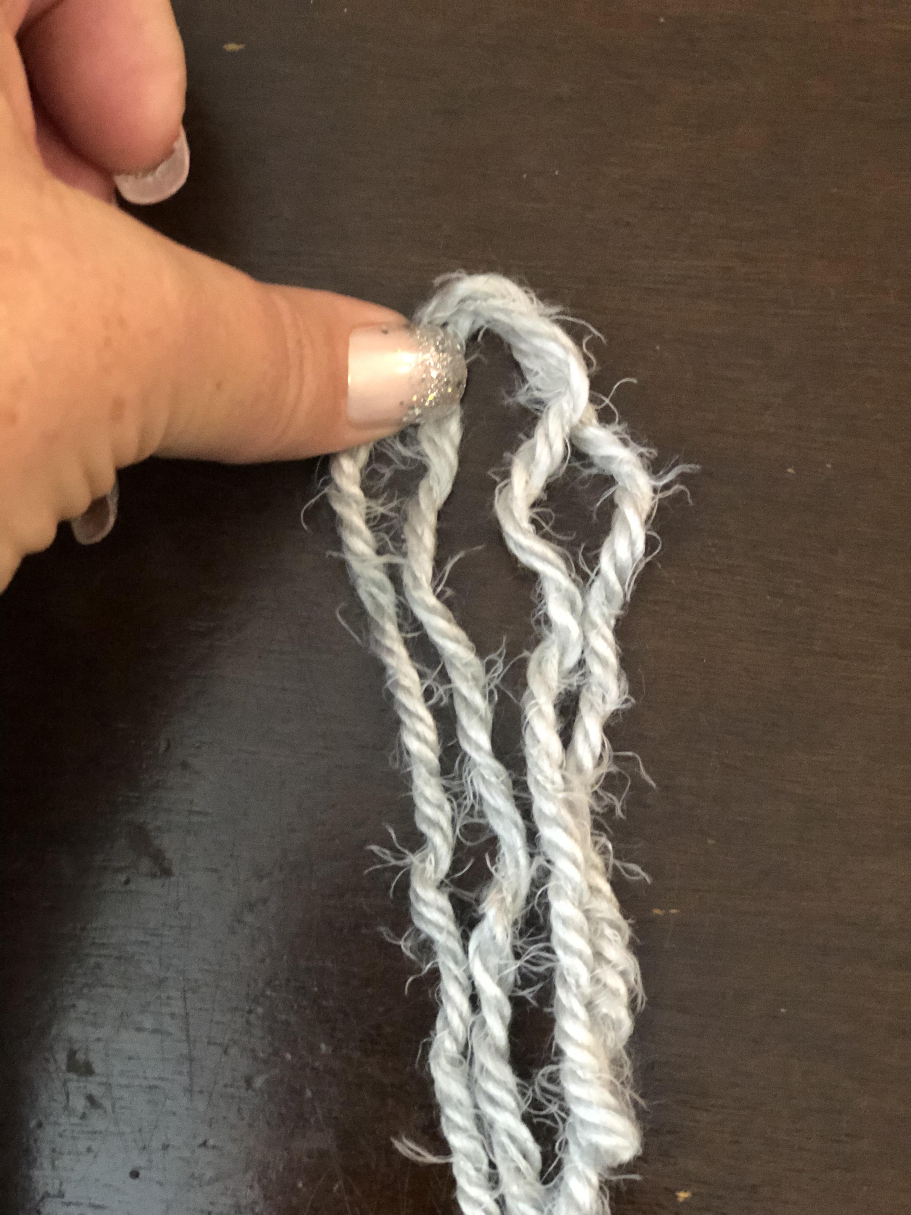 Place 2 strands together and fold in half ( photo #1) Place your hook threw stitch and loop the strands over hook ( photo #2) Pull loop thru stitch, Take the tail and wrap over hook and pull thru loop ( photo #3 & #4) Then pull strands to tighten ( photo #4) Do this across end length.