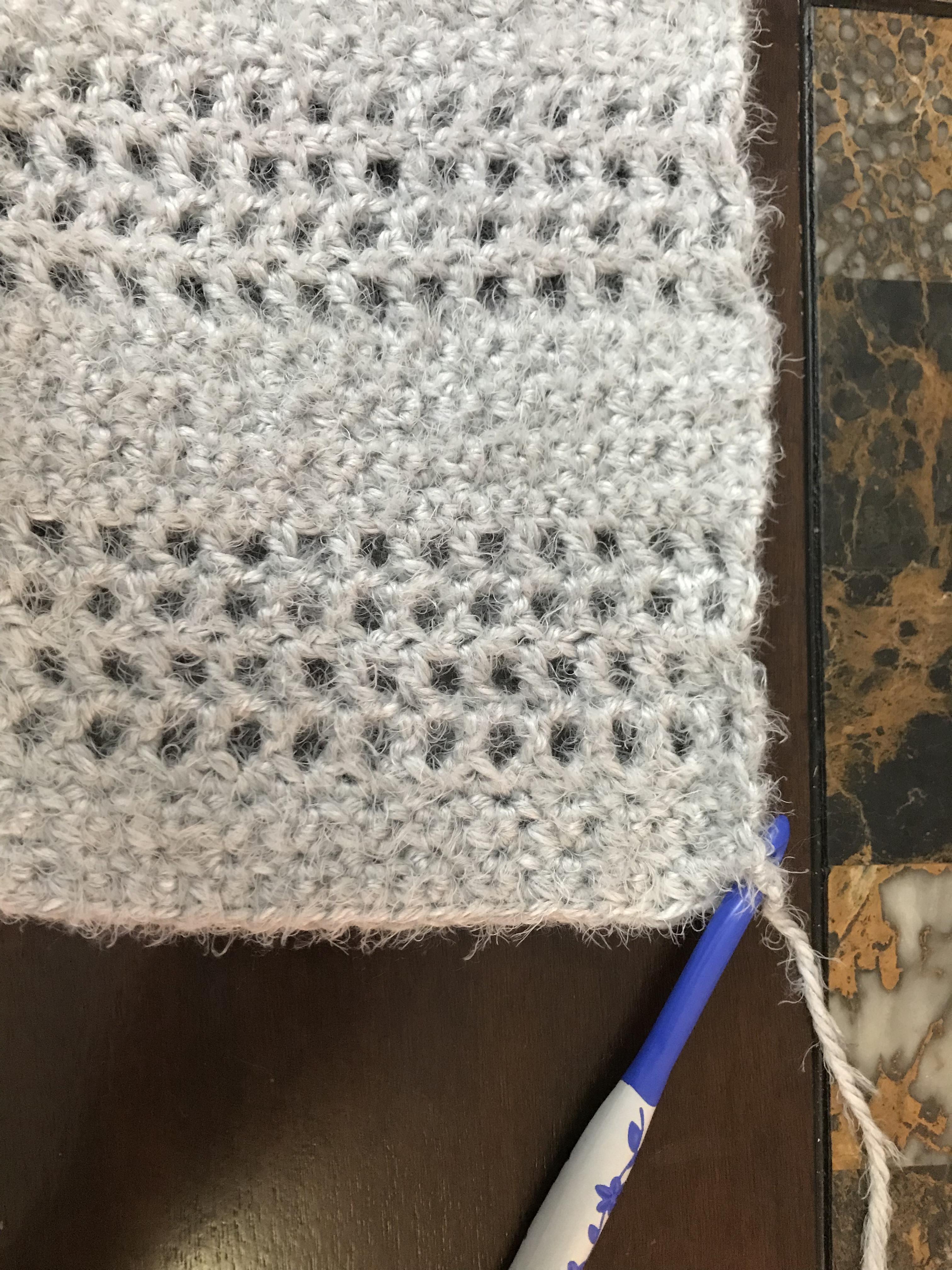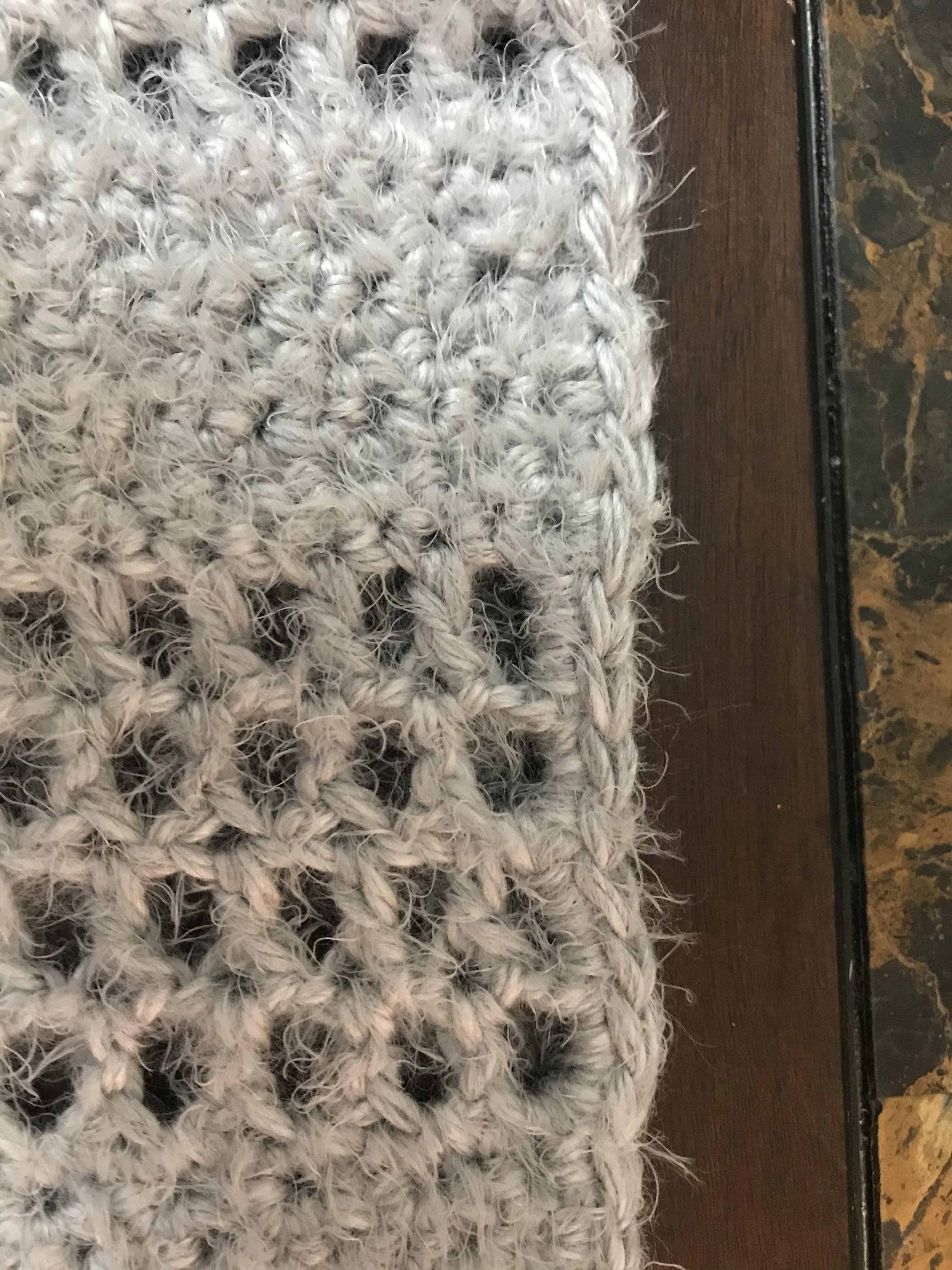 Now Repeat from Row 1 of grit stitch… You will repeat these steps til you have 11 blocks of Grit Stitch & 10 blocks of Mesh. The Start of the scarf and the end will bet the grit stitch blocks.
