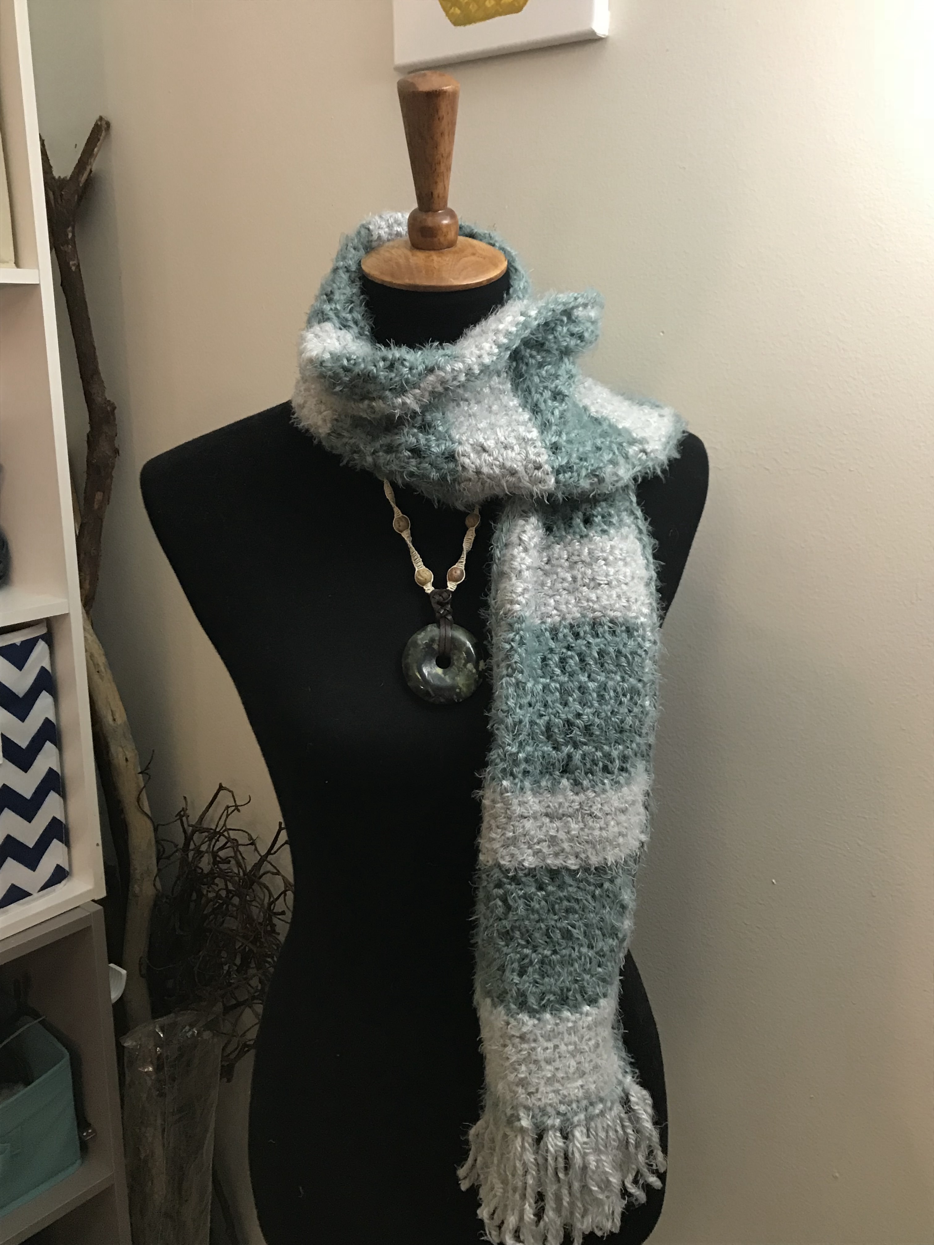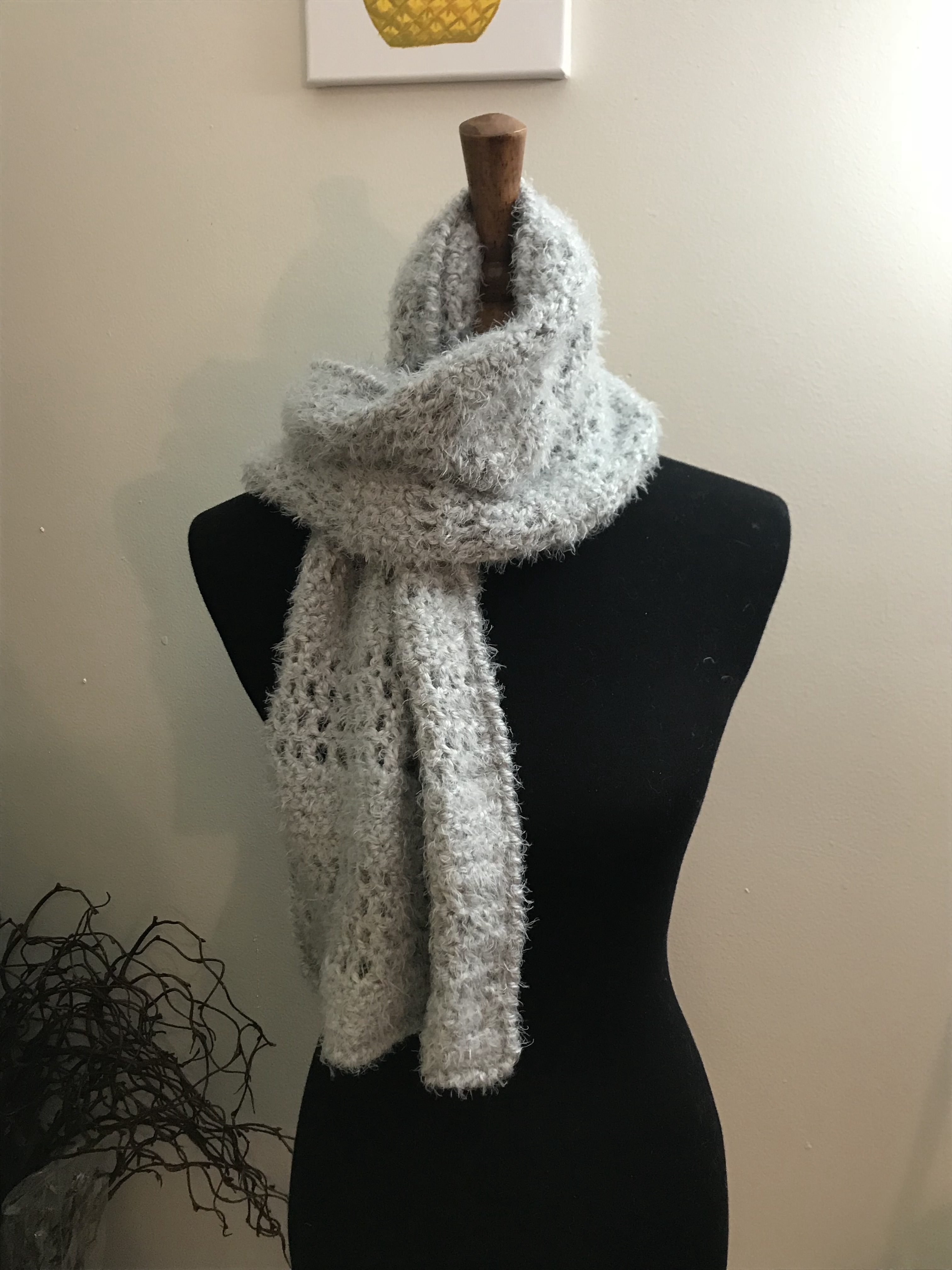 This Scarf was inspired by Red Heart Yarn’s Hygge. I absolutely Love the feel of this yarn. Feel free to read my review of this yarn.. Hygge. It is so soft and squishy it reminded me of my Chinchilla rabbit I had when I was young. You just wanna cuddle this yarn all day 😉